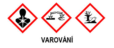 H410 Vysoce toxický pro vodní organismy, s dlouhodobými účinky.
